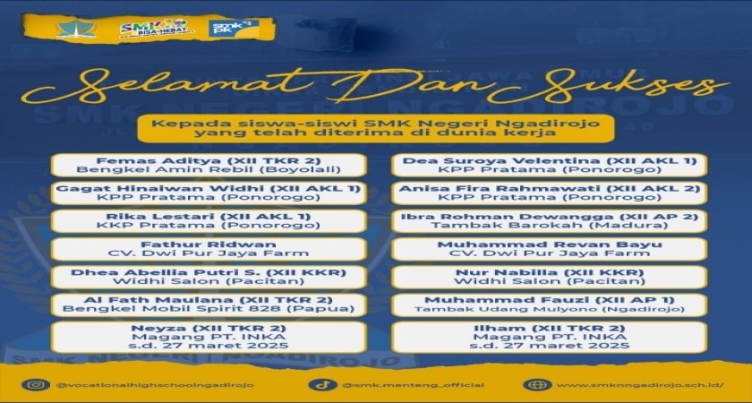 Keberhasilan para siswa tersebut menjadi bukti nyata bahwa lulusan SMKN Ngadirojo memiliki keterampilan yang dibutuhan industri. Bahkan sebelum lulus sudah diterima kerja. SMKN Ngadirojo terus berkomitmen untuk mencetak lulusan siap kerja dan berdaya saing.